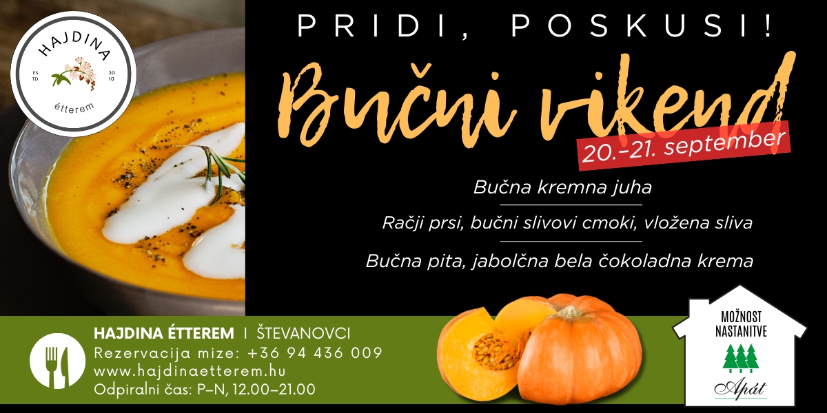Ob priložnosti Bučnega festivala v Őrségu te 20.–21. septembra vabimo na poseben gastronomski program v restavracijo Hajdina. V središču bo ena izmed najbolj priljubljenih jesenskih sestavin – buča –, iz katere bodo naši kuharji pripravili raznovrste jedi.