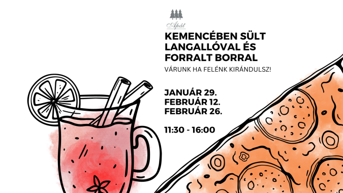Kemencében sült langallóval és forralt borral várunk ha felénk kirándulsz: Január 29., Február 12. és Február 26-án! Szeretettel Várunk! 11.30-16.00 óráig! Langalló: 1200 FT Forró tea: 500 FT Forralt bor: 550 FT Előzetes bejelentkezés nagyobb létszámú csoportok esetén szükséges! (Az programváltoztatás és az árváltoztatás jogát fenntartjuk!) FOGLALÁS: +36 (94) 436 009 apatpanzio.hu