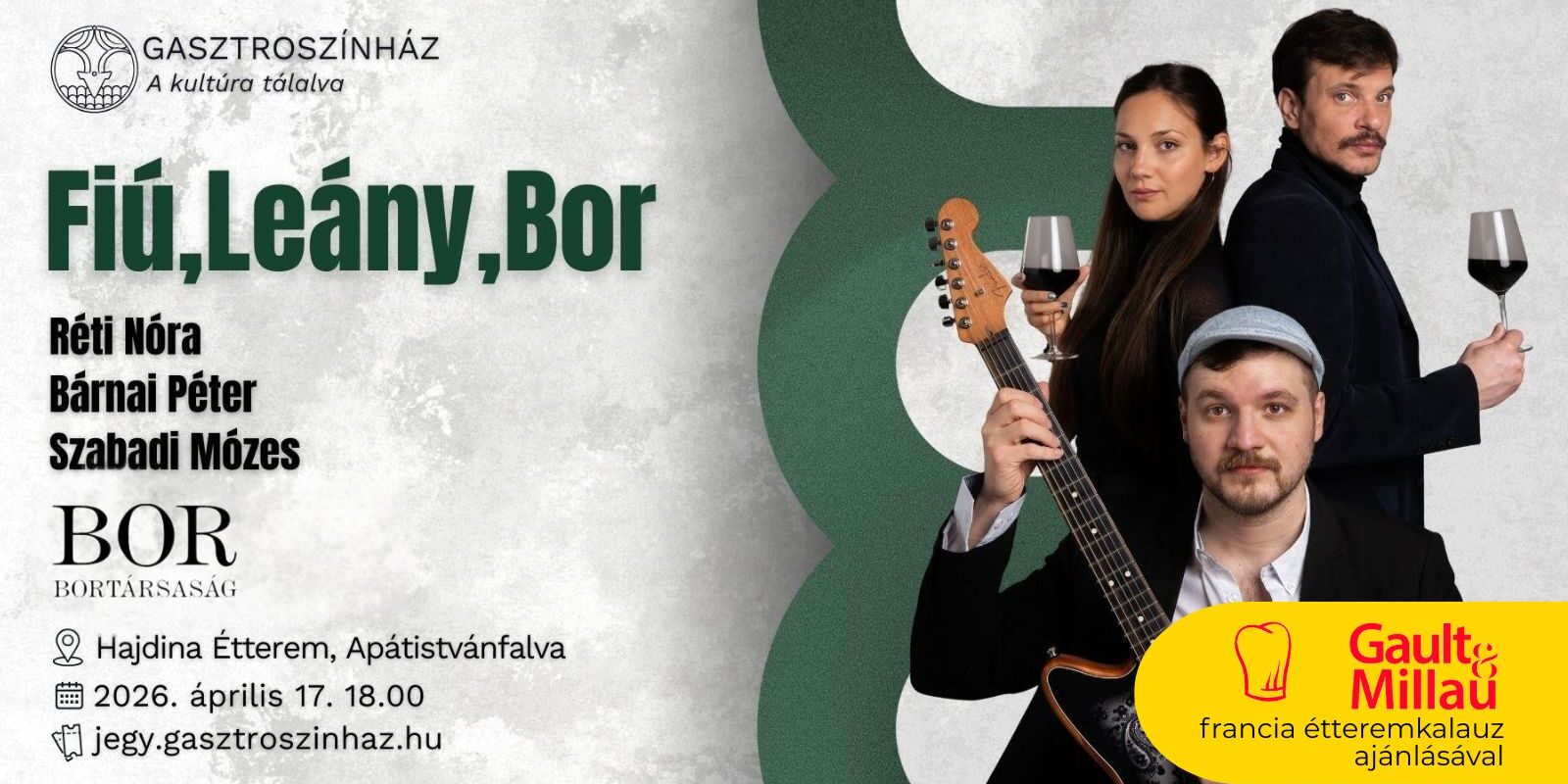 A gasztroszínházi belépőjegy sosem csak színházjegy, egy teljes körű élmény. A Gault&Millau által elismert fogásainkat a Fiú, Leány, Bor előadásának drámája és humora kíséri.